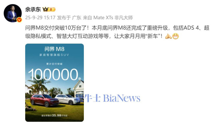 刚刚,华为董事长余承东发文宣布,家庭智慧旗舰SUV—问界M8累计交付突破10万台。